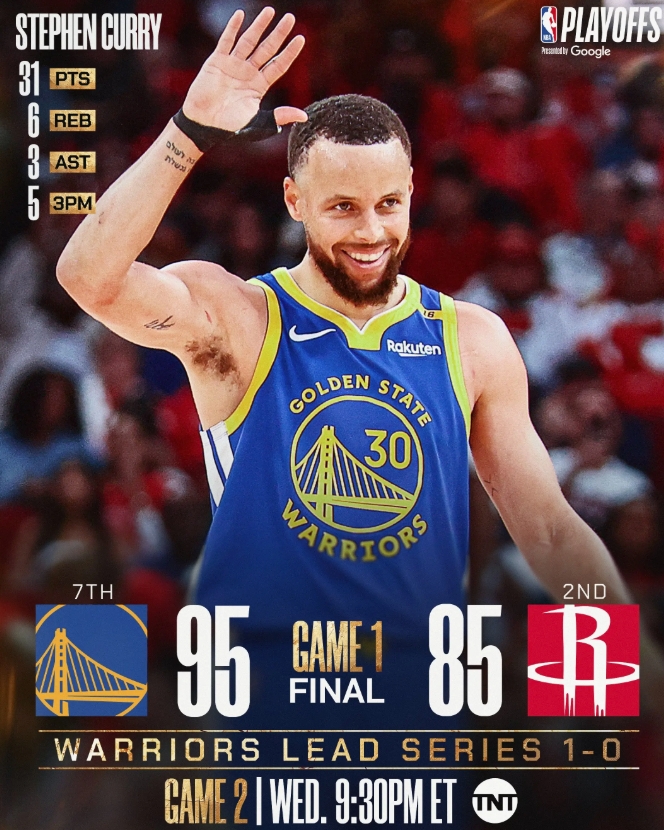 北京时间 4 月 21 日,NBA 西部季后赛首轮战火燃起,金州勇士客场 95-85 力克休斯敦火箭,顺利拿下系列赛开门红。此役,斯蒂芬・库里火力全开,以 31 分 6 篮板 3 助攻的亮眼数据,带领球队在第三节建立起 23 分的巨大优势,尽管火箭末节奋力追分,但勇士凭借扎实的防守与关键球能力,将胜果牢牢锁定。
